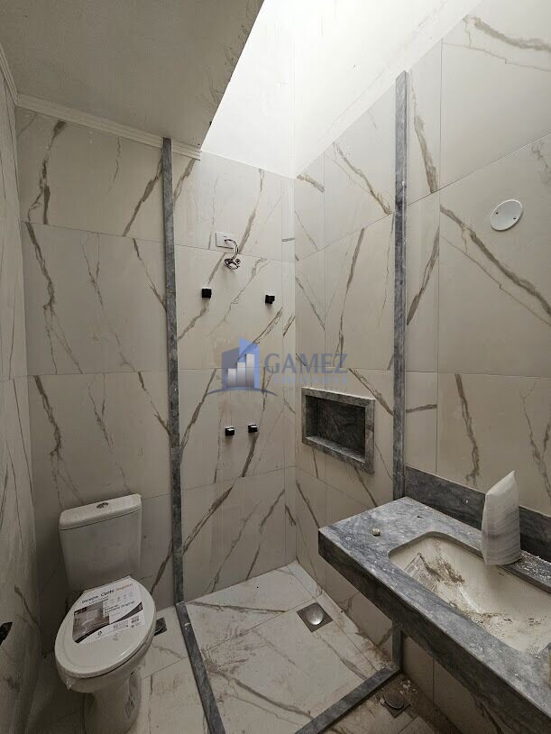 Todos os banheiros tem nicho para shampoo e revestimento de porcelanato marmorizado em todas as paredes. As bancadas também são de mármore, material mais nobre do que os granitos entregues em outras casas da região.